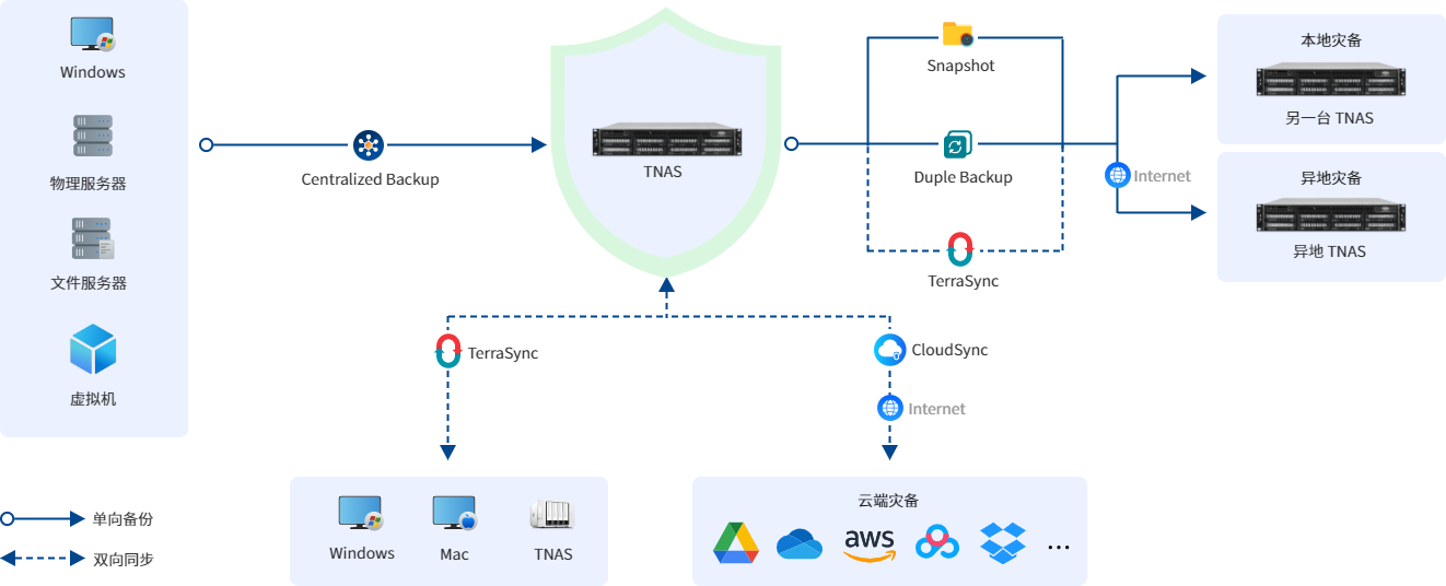 BBS(Business Backup Suite)는 TerraMaster가 자체 개발한 전체 시나리오 상업용 백업 솔루션입니다. 비즈니스 애플리케이션을 위해 특별히 설계된 BBS는 엔터프라이즈 사용의 고성능 요구 사항을 완전히 충족하는 포괄적인 백업 구성 요소를 제공합니다. 사용자는 실제 시나리오에 맞게 TerraMaster의 BBS 구성 요소를 유연하게 결합하여 다양한 백업 전략을 생성하여 중소기업의 대부분의 백업 요구 사항을 충족할 수 있습니다. 핵심 구성 요소에는 Duple Backup(DB), Centralized Backup(CB), TerraSync(TS), CloudSync 및 Snapshot이 포함됩니다.